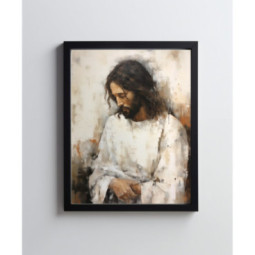 Plakat „Święta Cisza Jezusa” przedstawia Jezusa w białej szacie, którego twarz emanuje spokojem i pewnością, oddając atmosferę Bożej obecności. Obraz ukazuje głęboką duchową ciszę, zapraszając do kontemplacji i modlitwy. Abstrakcyjne tło w delikatnych, pastelowych kolorach oraz subtelne pociągnięcia pędzla podkreślają spokój i harmonię, co sprawia, że plakat wprowadza w atmosferę spokoju i refleksji. Idealny do przestrzeni, które potrzebują wyciszenia i modlitewnego nastroju. Doskonały wybór na prezent religijny, dekorację do kościoła czy domowej kaplicy. Spokojna postać Jezusa w tym obrazie może być także wyjątkowym symbolem wspólnej modlitwy i głębokiej więzi z Bogiem.
